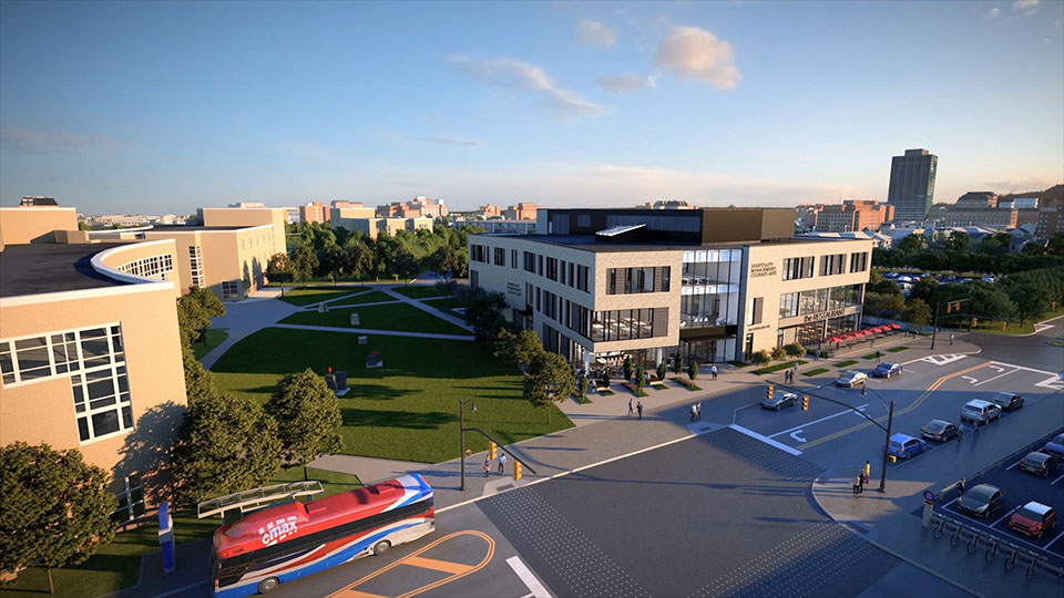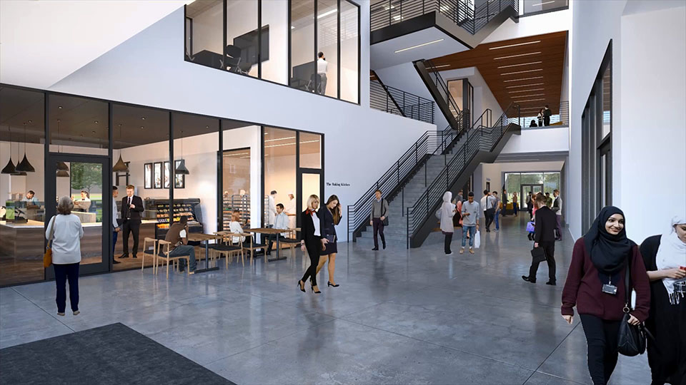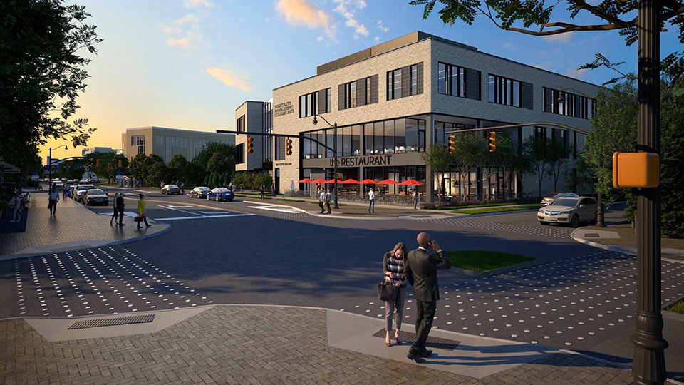 In addition to doubling Hospitality and Culinary Arts enrollment capacity to more than 1,500 students, the new 80,000-square-foot, three-floor facility will include a professionally managed, student-staffed, 100-seat sit-down restaurant and bar and 20-person retail café and bakery, both with outdoor seating; and a 400-plus seat banquet-capacity conference center with onsite catering and a sweeping balcony overlooking downtown. The site will also feature a teaching and innovation kitchen, farm-to-table food production gardens and a 100-seat culinary theater, among many other student education assets.