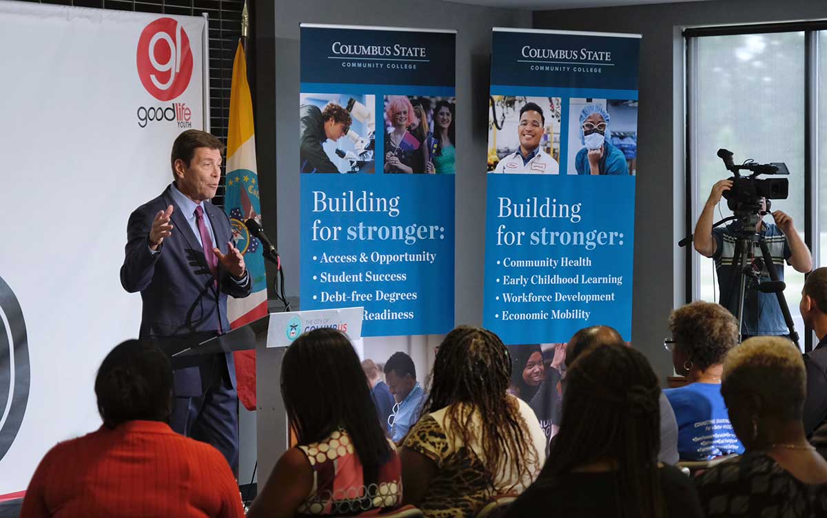 Columbus State President David Harrison addresses community leaders at the college's announcement of a new career development center to be built on land purchased from First Church of God on the city's southeast side.