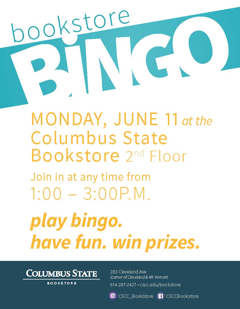 The Columbus State Bookstore is hosting bingo on Monday, June 11. Visit the second floor of the bookstore anytime between 1:00 and 3:00 p.m. to play for fun prizes.