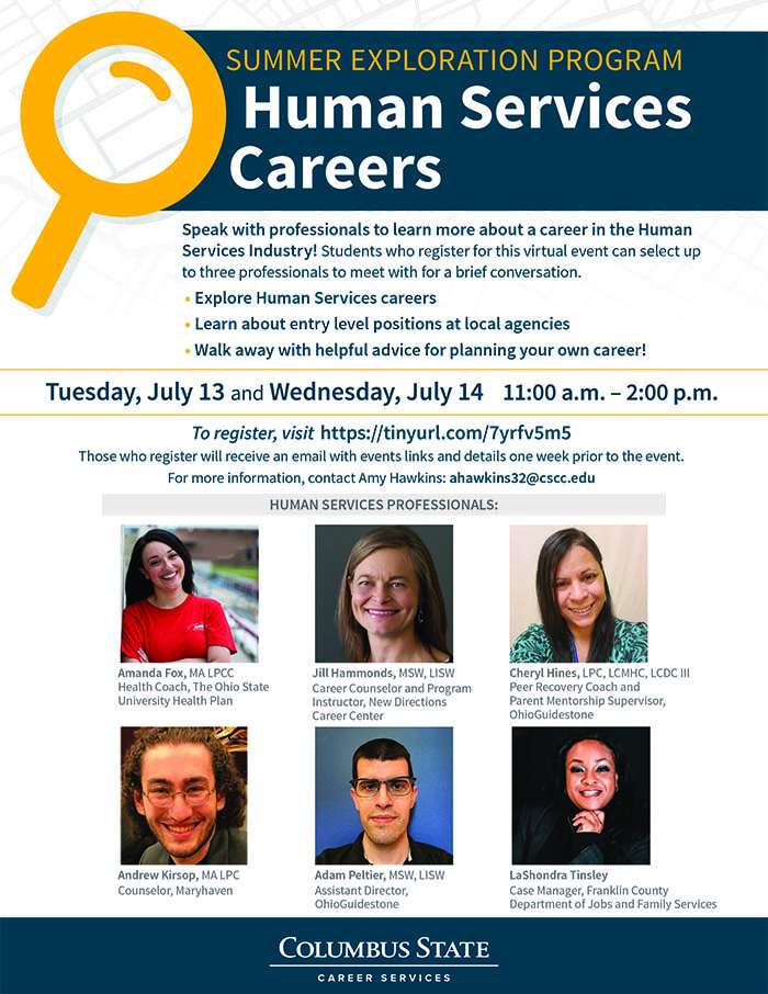Register for the Career Services Summer Exploration Program virtual event. It will be held on Tuesday, July 13, and Wednesday, July 14, from 11 a.m.-2 p.m. each day. You may attend one or both days for the opportunity to engage in a brief, 25-minute conversation with up to three professionals in Human Services careers to learn about the work they do. You will also receive information on entry-level opportunities and tips for career planning.