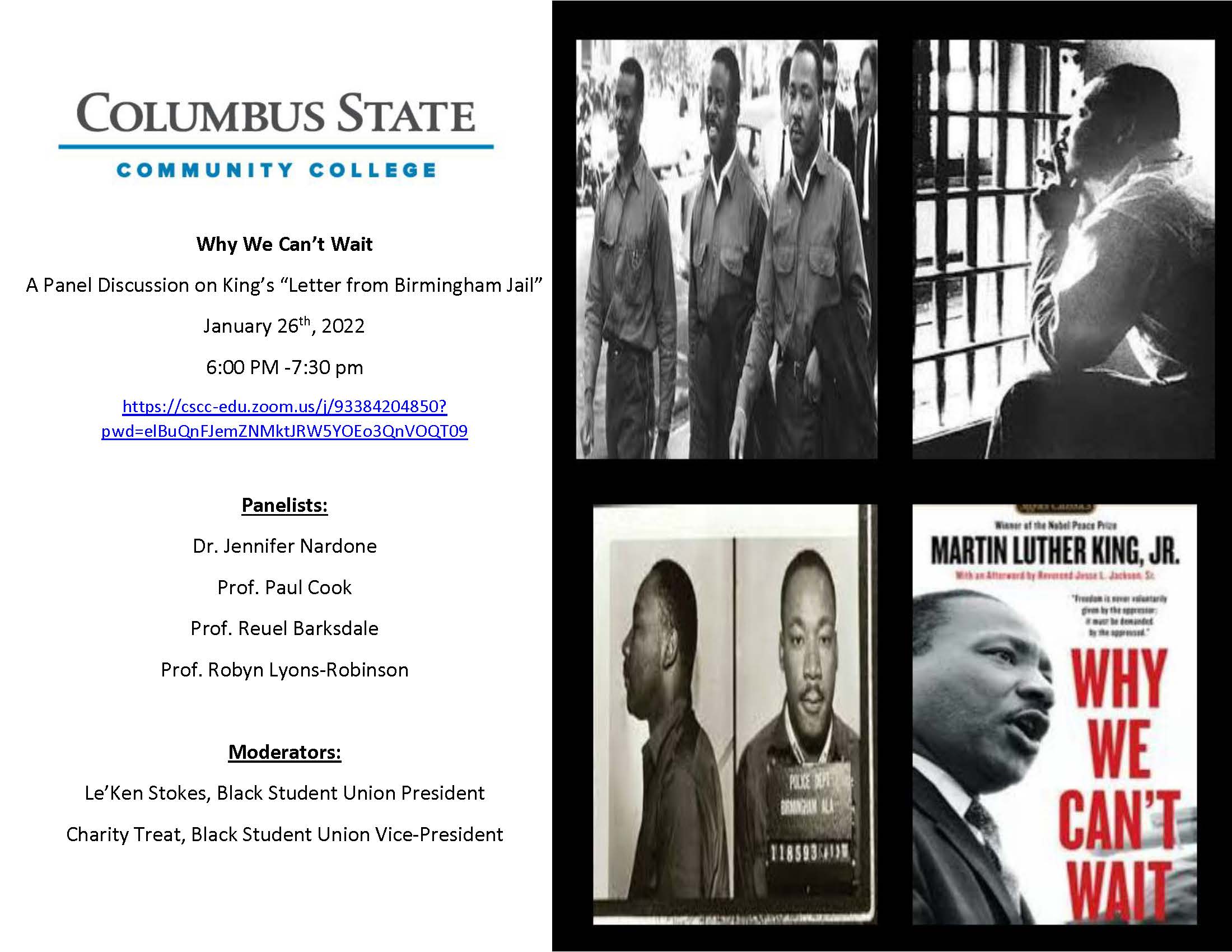 In celebration of Columbus State’s annual Dr. Martin Luther King Jr. Week and the life, service, and activism of King, the Black Student Union, in collaboration with the MLK Planning Committee, will hold a virtual panel discussion on the historic “Letter from Birmingham Jail.”
