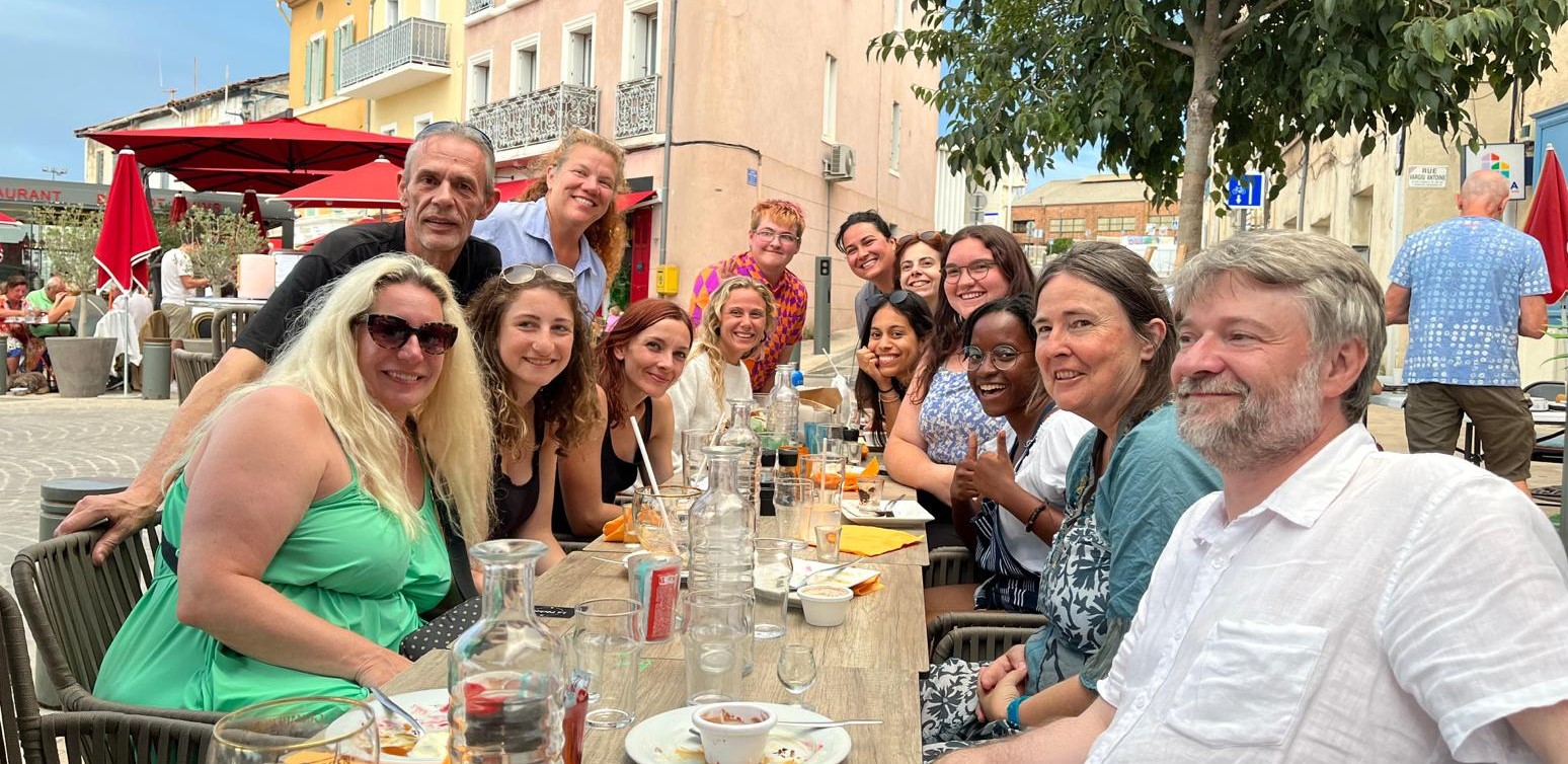 Above, Columbus State student Brittany Blevins, standing at the very back of the table on the right, gathers with other international students and faculty at a dinner in La Pecherie, France, on July 7 as part of a study abroad program.