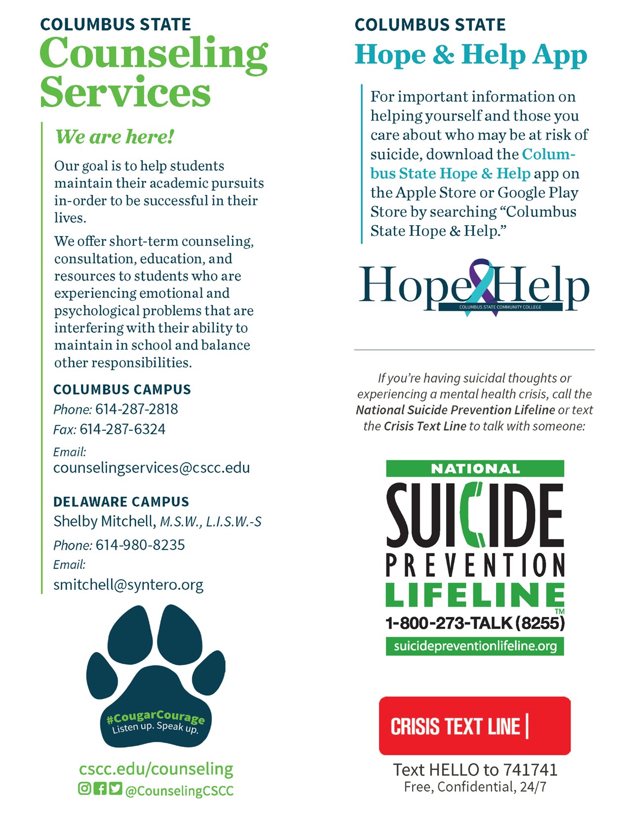 Counseling Services and the Bookstore collaborated to create bookmarks for students. The bookmarks highlight critcial health services for students, incluidng Counseling Services contact information at the Columbus and Delaware offices. The reverse side features resources such as the Hope and Help app, Suicide Prevention Lifeline, and the crisis text line. The Bookstore includes a bookmark with each student book order.