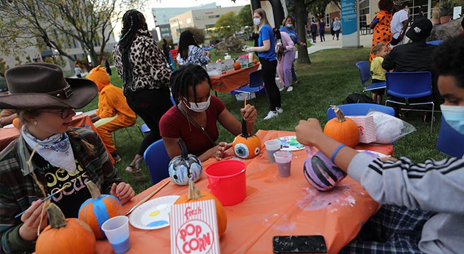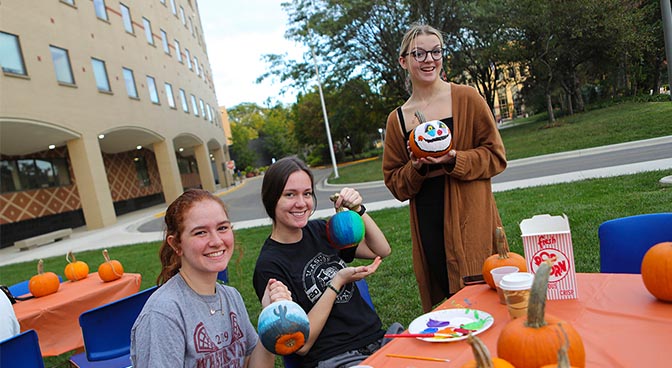 Students painting pumpkins before the movie.