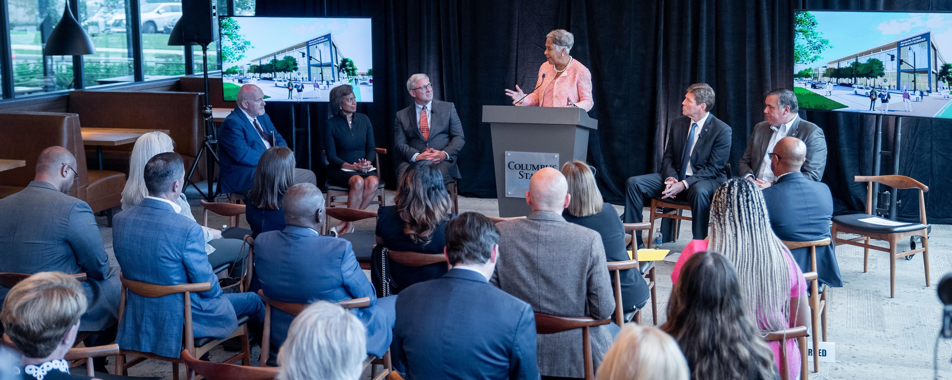Above: U.S. Rep. Joyce Beatty speaks from the podium about the OhioHealth-Columbus State partnership, which was announced to key stakeholders and the media on June 27 in Mitchell Hall. The other speakers seated left to right were Franklin County Commissioner John O’Grady, OhioHealth Senior Vice President Karen Morrison, OhioHealth President and CEO Dr. Steve Markovich, President Harrison, and Columbus Mayor Andrew Ginther.
