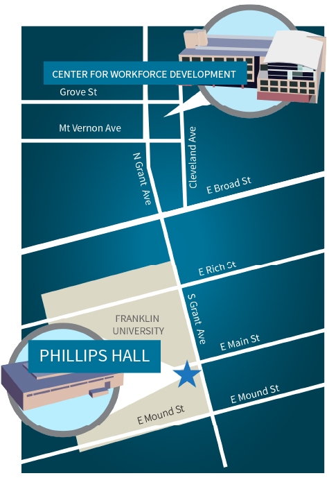 Phillips Hall is located at 303 S. Grant Ave. on the corner of Grant Avenue and E. Main Street, about a mile southwest of the Columbus Campus. (The building is directly across the street from a McDonald's restaurant.)