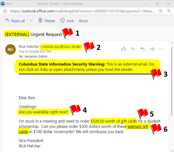 1. Use caution when you see EXTERNAL. Indicates the email came from outside the college.