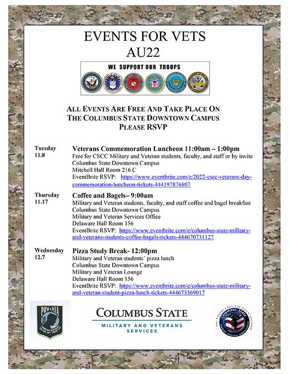 The Columbus State Military and Veterans Services Department provides individualized enrollment and referral services to assist community members in successfully meeting their educational and career goals. We are committed to providing uncompromising service by adhering to the highest standards of compassion, commitment, excellence, professionalism, integrity, accountability and stewardship.